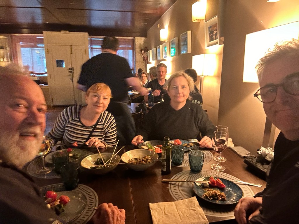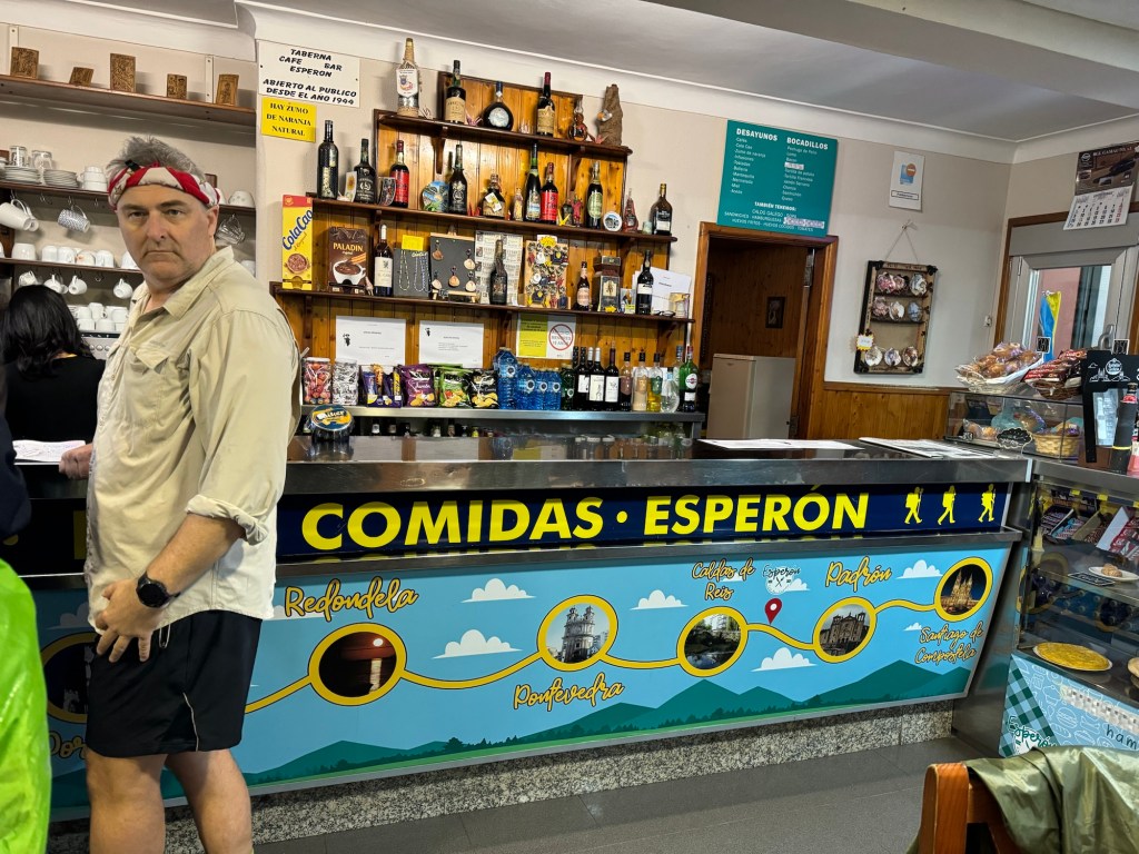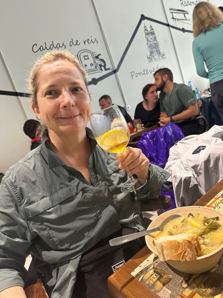 We had thoughts of collecting a Padron Compostela, but the weather was against us. We thankfully found a little restaurant called A Casa de Martinez. We enjoyed a fabulous tomato salad, Thai rice, fresh bread and olive oil, beef cheeks, local black paella and dessert all washed down with some lovely wine.