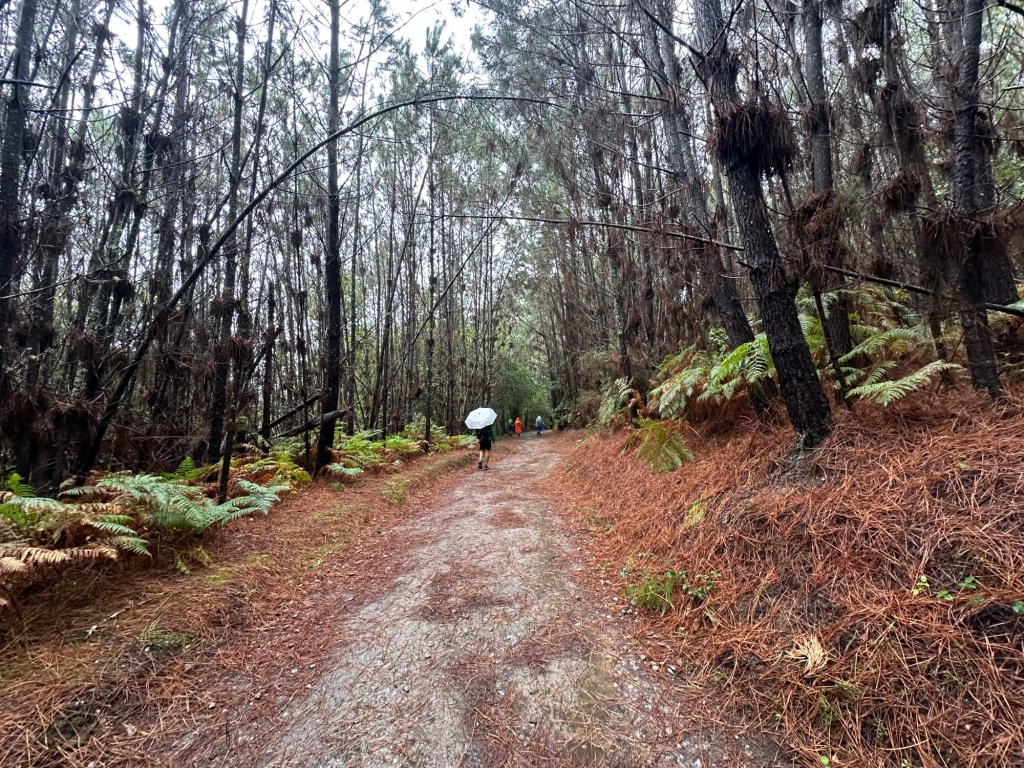 The forest was dark as a large number of Pilgrims walked out of town. We saw people with plastic bags over their socks, over their shoes and over their heads. And still it wasn’t raining.